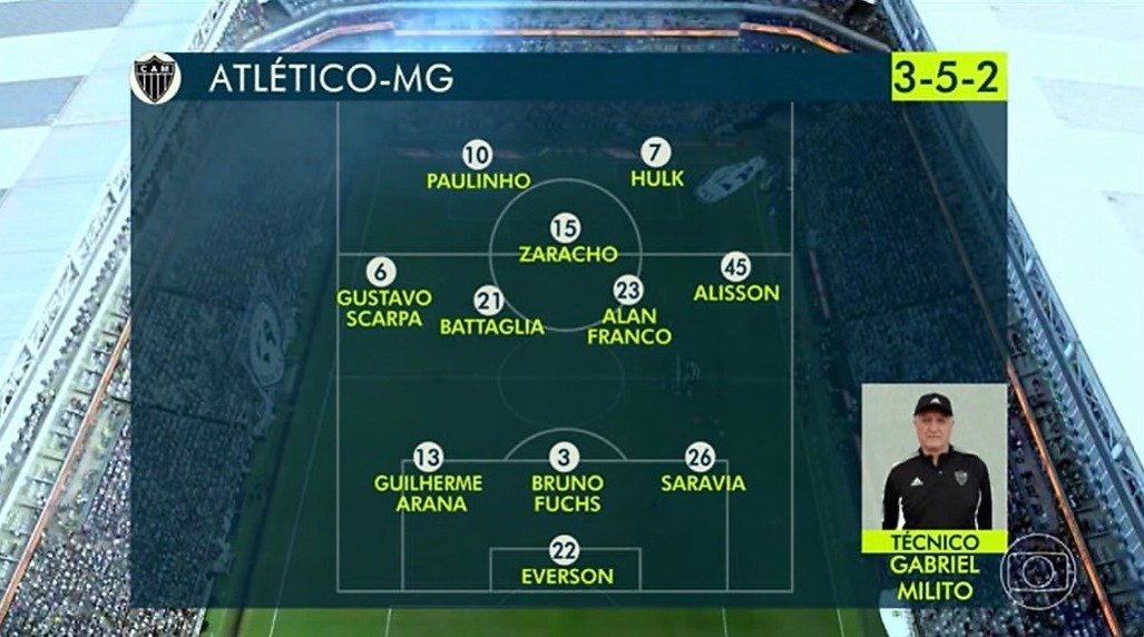 No lugar do argentino, apareceu a foto de Felipão, ex-treinador do Galo, que deixou o cargo em 20 de março, há pouco mais de dois meses. O erro foi notado pelo narrador Rogério Corrêa, que apontou a ‘gafe’ da transmissão.