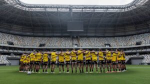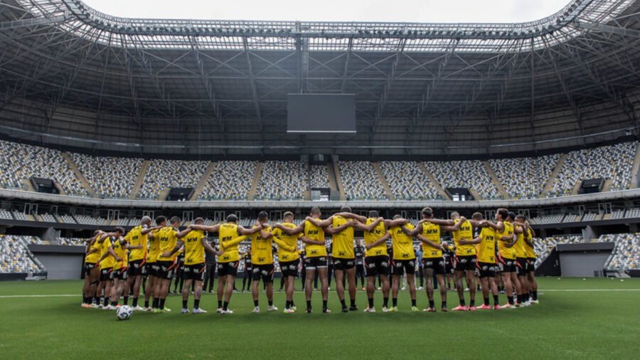 O elenco do Atlético fez o primeiro treino no gramado sintético da Arena MRV neste sábado (3/5), em preparação para o confronto com o Juventude, pela sétima rodada do Campeonato Brasileiro. Do lado de fora, torcedores se reuniram para fazer protesto em relação ao momento que vive o clube dentro e fora de campo.