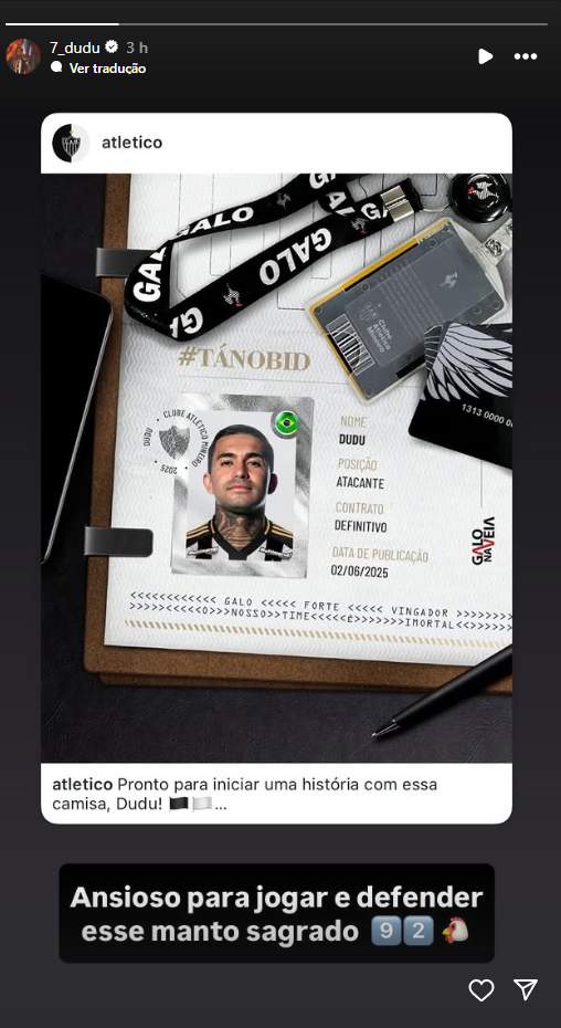 Nas redes sociais, Dudu comentou a liberação e se disse “ansioso” para representar o Atlético nos gramados.