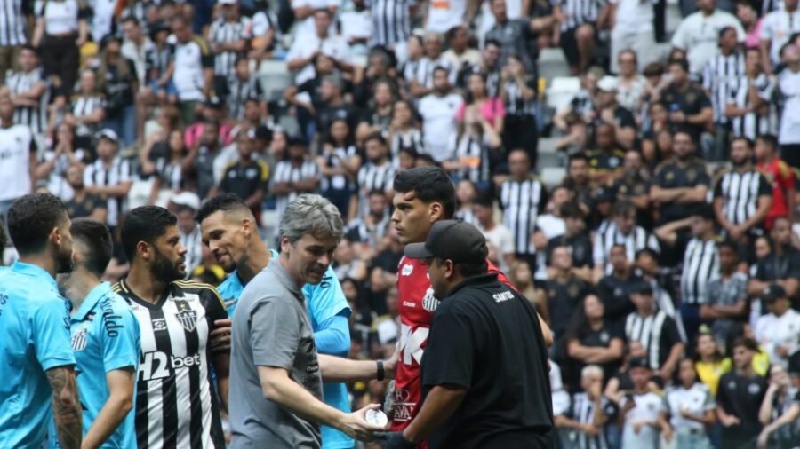 O duelo entre Atlético e Santos, neste domingo (14/9), pela 23ª rodada do Campeonato Brasileiro, ficou marcado por uma cena preocupante no segundo tempo. O goleiro Gabriel Brazão, do Santos, levou a pior em um choque de cabeça com o joelho de Igor Gomes, do Galo, e precisou deixar o gramado da Arena MRV de ambulância.