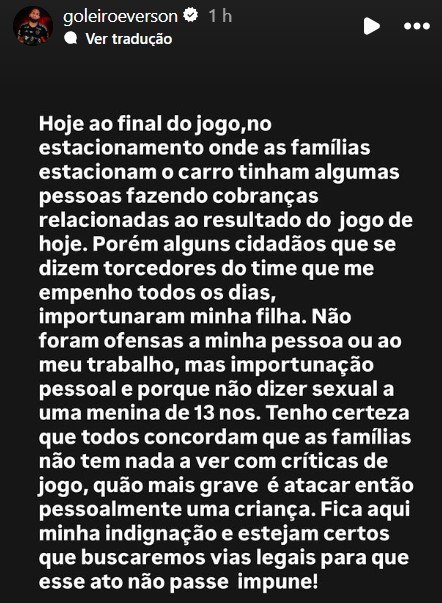 O goleiro Everson, do Atlético, utilizou suas redes sociais para denunciar um episódio grave envolvendo sua filha de 13 anos após o empate do Galo com o Santos (1 a 1), neste domingo (14/9), na Arena MRV. O atleta relatou que, ao final da partida, enquanto se dirigia ao estacionamento destinado a famílias, algumas pessoas importunaram a adolescente.