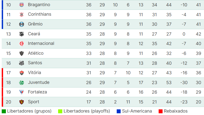 Sendo assim, se ambos os concorrentes vencerem na 30ª rodada e o Galo for derrotado pelo Ceará, o time de Jorge Sampaoli passará a integrar a zona de rebaixamento. Veja os compromissos dos oponentes alvinegros a seguir.