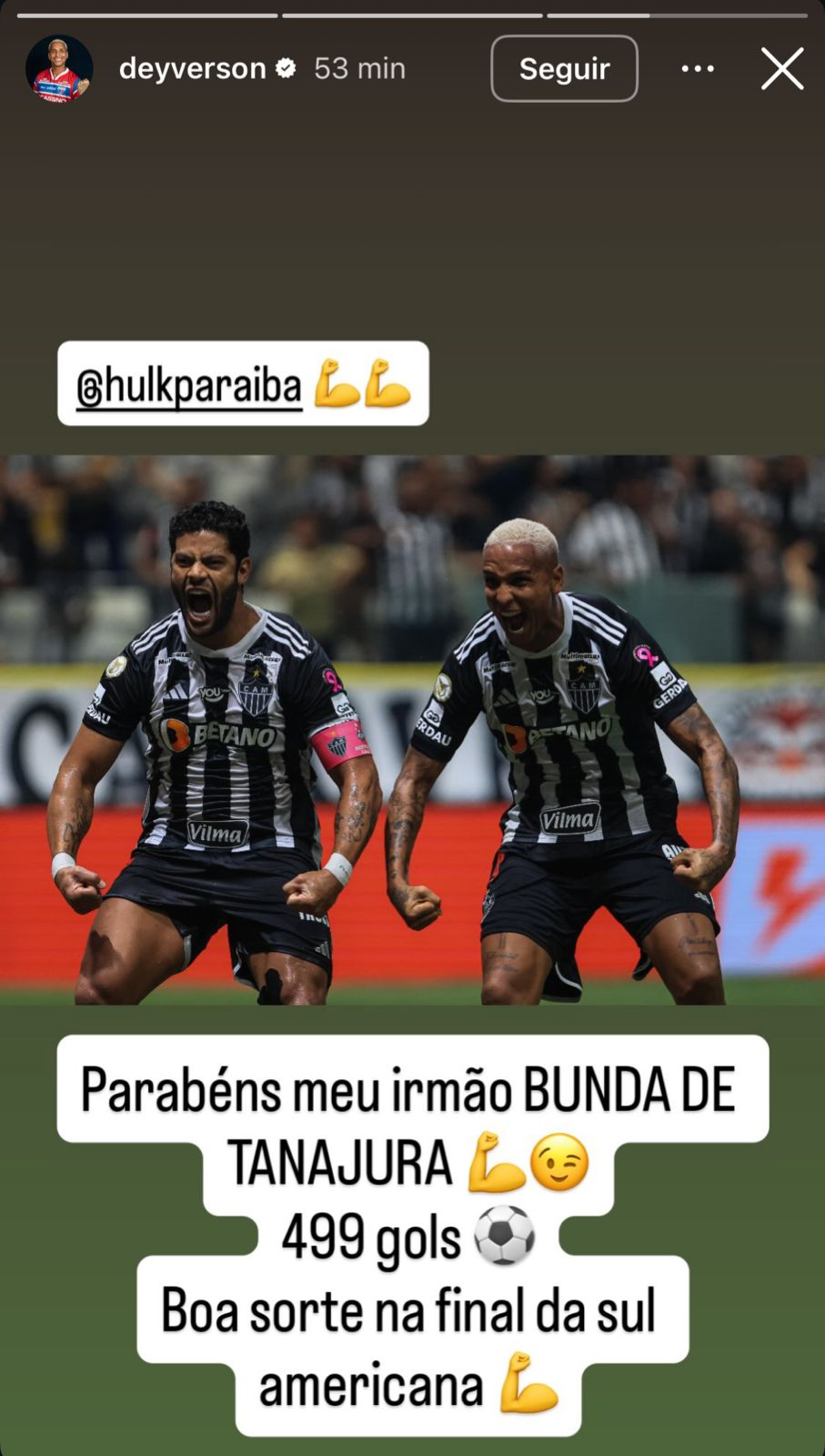 No Instagram, Deyverson parabenizou Hulk pelo gol marcado contra o Independiente del Valle, na vitória por 3 a 1, nessa terça-feira (29/10), na Arena MRV. Além de ter anotado o tento da classificação do Galo, Hulk espantou a má fase – eram 15 jogos sem marcar, a maior seca do atacante pelo Atlético.