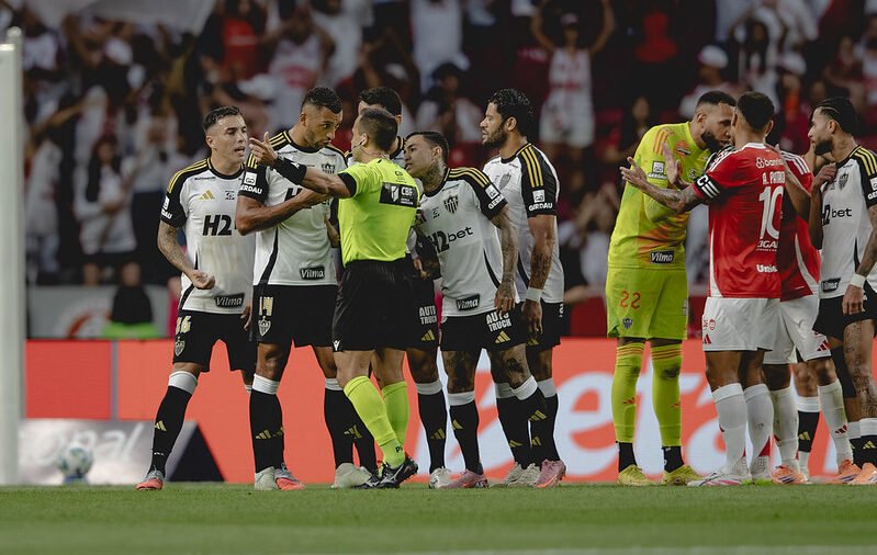 Já no outro lance reclamado, o árbitro de campo assinalou pênalti do lateral-esquerdo colorado Bernabei em Rony. Contudo, após revisão no VAR, a penalidade foi anulada com o entendimento de que a carga feita pelo jogador do Inter não teve intensidade suficiente para derrubar o atacante do Galo.