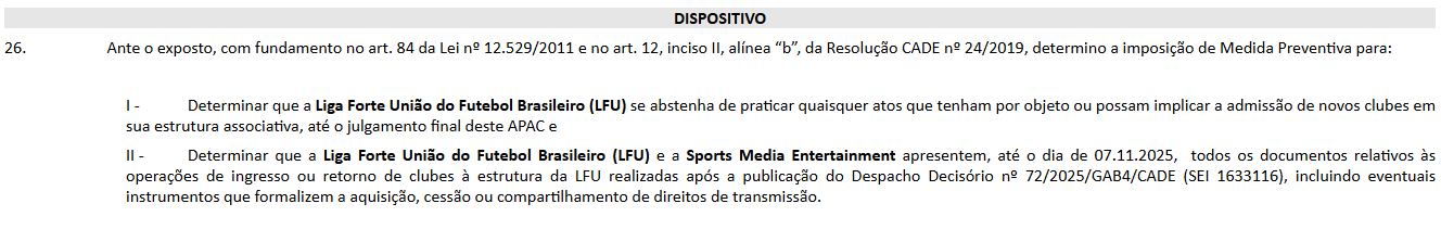 “A análise da configuração de gun jumping não se limita ao ato constitutivo inicial da Liga Forte Futebol do Brasil [LFU], devendo abranger eventuais transformações estruturais posteriores, tais como a entrada e saída de clubes e negócios jurídicos celebrados com investidores”, lê-se.