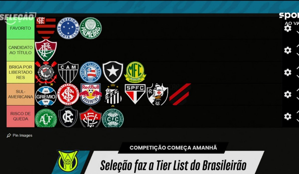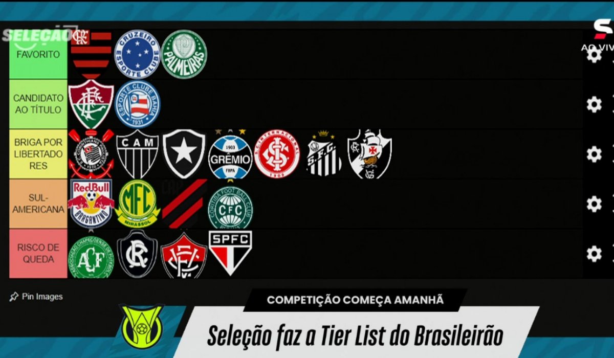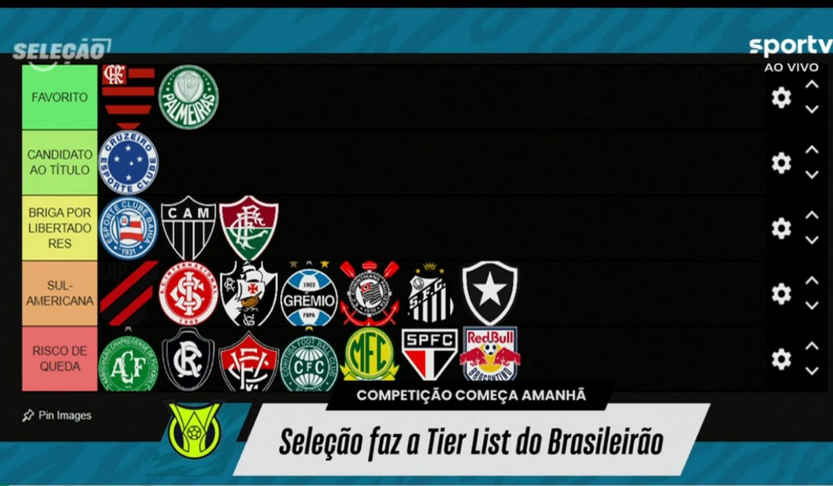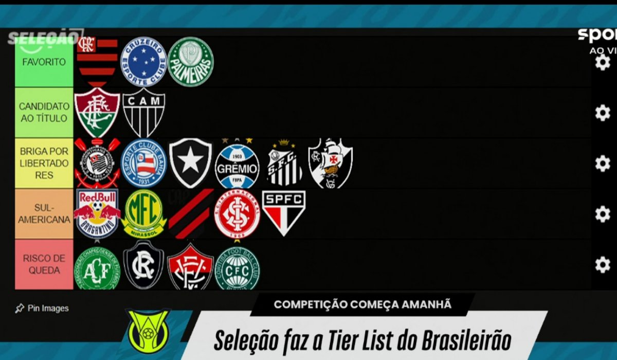 Durante o programa Seleção SporTV, nesta terça-feira (27/1), Jéssica Cescon, Richarlyson, Paulo Nunes e André Rizek se reuniram para fazer a tier-list do campeonato. Foram elencados os times favoritos ao título, os candidatos ao título, os que brigam por Libertadores, os que brigam por Sul-Americana e os que serão ameaçados de rebaixamento.