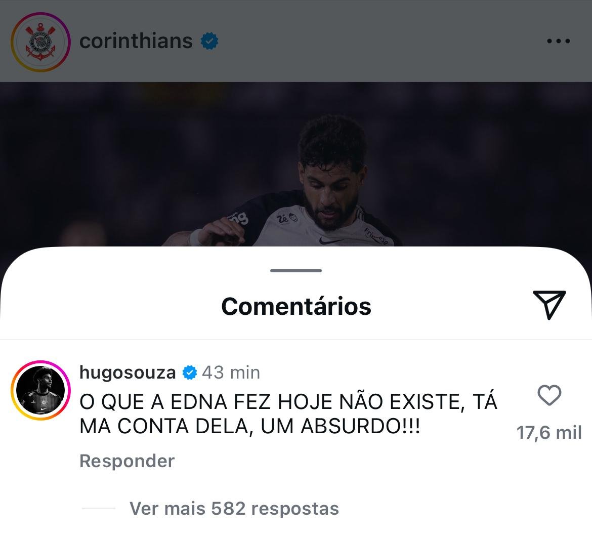 O goleiro Hugo Souza, do Corinthians, usou as redes sociais para criticar a árbitra Edina Alves Batista (SP) pela atuação na derrota alvinegra por 2 a 1 para o Bragantino. A equipe da capital saiu atrás, buscou o empate, mas viu os mandantes marcarem nos acréscimos do segundo tempo no Estádio Cícero Souza Marques, em Bragança Paulista, pela 32ª rodada do Campeonato Brasileiro.