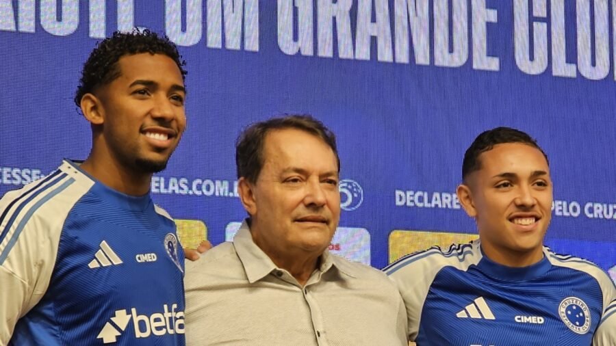 Reforços do Cruzeiro para a reta final de 2025, Ryan Guilherme e Kauã Moraes posaram para fotos ao lado do presidente Pedro Lourenço
