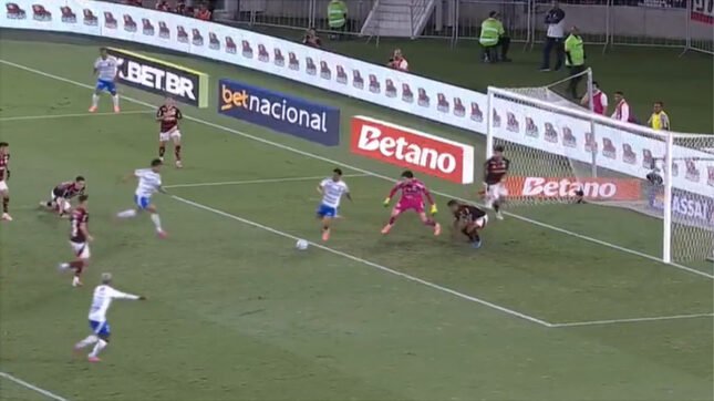 Lucas Romero lançou para Kaiki, que dominou a bola na linha lateral da grande área e tocou para trás. Kaio Jorge bateu de primeira, Rossi deu rebote, e Christan, um pouco sem jeito, mandou novamente em cima do goleiro rubro-negro.