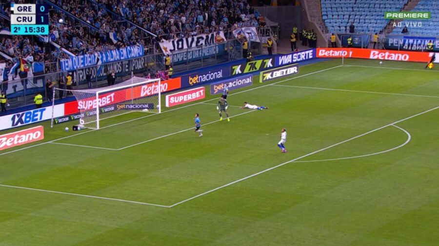 Aos 15 minutos da segunda etapa, o artilheiro do Cruzeiro na temporada apostou corrida com o zagueiro Walter Kannemann e saiu na frente. Quando invadiu a grande área, arriscou chute e carimbou o travessão do goleiro Tiago Volpi.