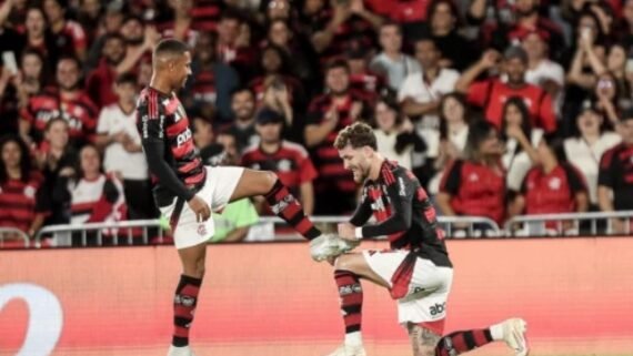 - 2×0. O Flamengo ampliou o placar com gol de Plata, que apareceu na área completou para o fundo da rede após um lindo passe de trivela rasante de Arrascaeta pela esquerda.