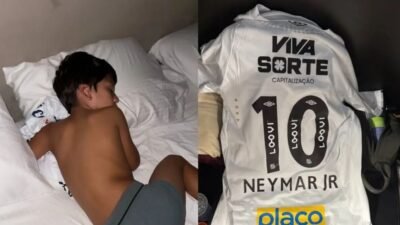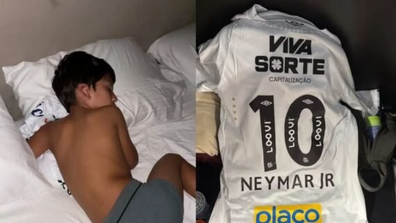 Filho de astro da Série A encontra Neymar, ganha camisa e dorme abraçado ao presente