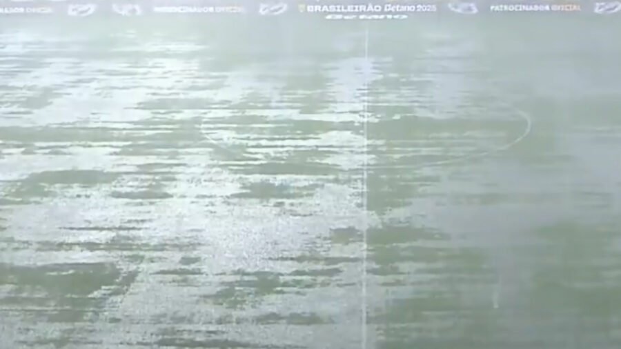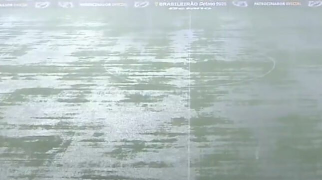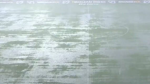 O juiz Rodrigo José Pereira de Lima até deixou o vestiário e foi ao campo após o intervalo, porém os testes não foram satisfatórios. A bola não rolou, parou em poças, e o árbitro decidiu por paralisar a partida devido à chuva. Veja a situação do gramado no vídeo abaixo.