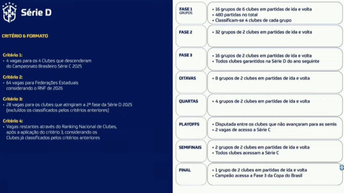 A Confederação Brasileira de Futebol (CBF) anunciou, na manhã desta quarta-feira (1/10), na sede da entidade no Rio de Janeiro, a mudança no formato da Série D do Campeonato Brasileiro. A partir de 2026, o torneio terá quase 100 times.