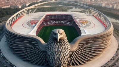 Das criações da inteligência artificial, chamou a atenção a imponência do ‘novo’ Estádio da Luz, do Benfica. O modelo tem uma águia, símbolo do clube, na estrutura da parte externa.