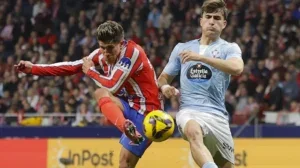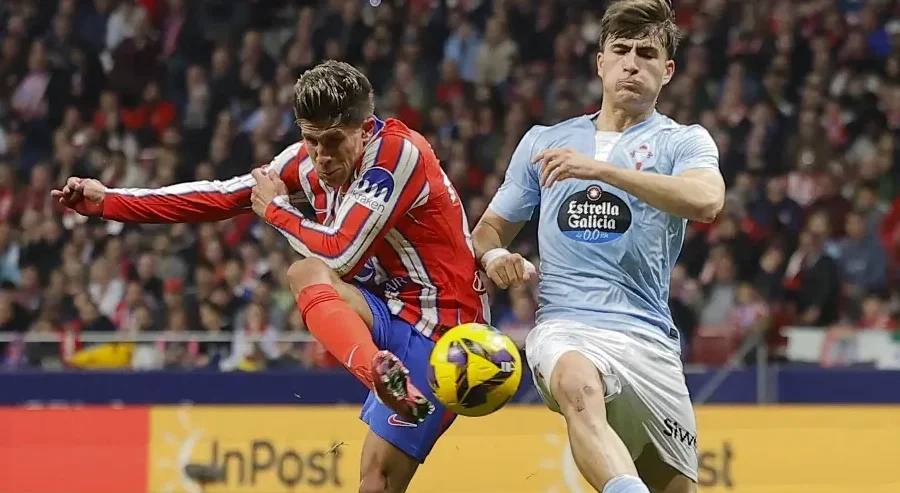 O Atlético de Madrid, que jogou com um a menos desde a expulsão do volante Pablo Barrios aos sete minutos, não aproveitou o tropeço do Real Madrid para assumir a ponta da tabela do Campeonato Espanhol e empatou em 1 a 1 com o Celta de Vigo no estádio Metropolitano.