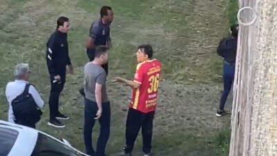 Em um vídeo que viralizou nas redes sociais, o quarto árbitro Rodrigo Garcia é visto com a arma na discussão com civis. Alguns gritos, como “tem criança, irmão”, foram proferidos pelos comerciantes, enquanto o membro da arbitragem se apresentou como policial militar e avisou que eles iriam à delegacia. Veja o vídeo abaixo.