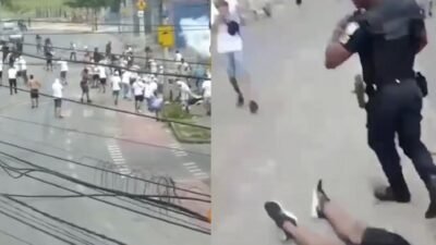 Em vídeos que circulam nas redes socias, é possível ver o embate entre as organizadas e um dos homens caído no chão com ferimentos graves. Veja: