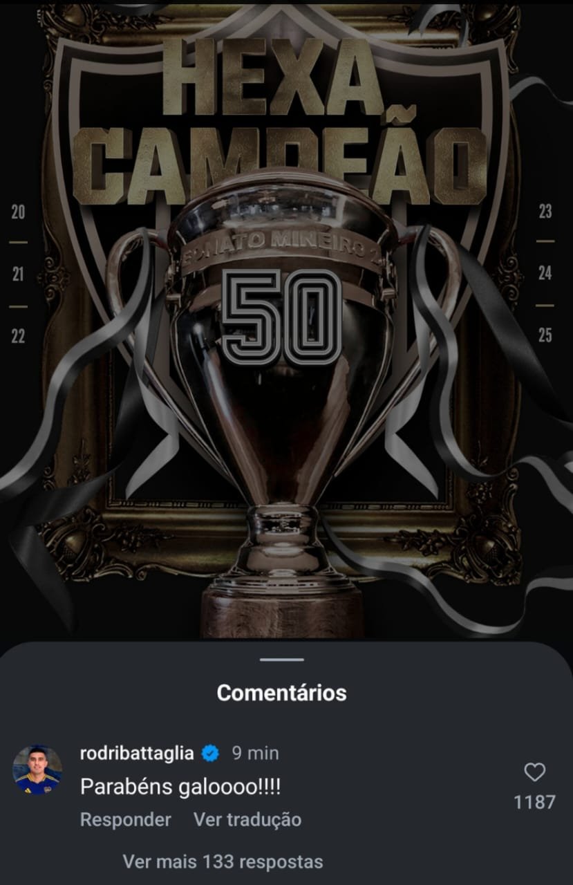 O zagueiro Rodrigo Battaglia parabenizou o Atlético pela conquista do Campeonato Mineiro. O alvinegro confirmou o título neste sábado (15/3), com a derrota por 1 a 0 para o América no Mineirão, pelo segundo jogo da decisão – no duelo de ida, o Galo havia vencido por 4 a 0. Além do argentino, o ex-volante Rosinei, campeão da Copa Libertadores pelo clube, celebrou a taça.