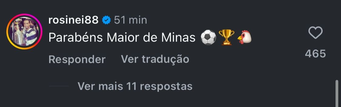 Na mesma postagem, Rosinei escreveu: “Parabéns, maior de Minas”. O ex-jogador vestiu a camisa do Atlético entre 2013 e 2014, tendo disputado 45 jogos, marcado quatro gols e dado uma assistência.