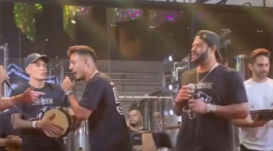 O lateral-esquerdo Guilherme Arana, o meio-campista Gabriel Menino e os atacantes Hulk e Deyverson subiram ao palco e ‘formaram’ um grupo de pagode.