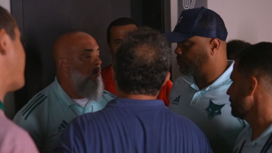 Ao fim do primeiro tempo, as câmeras do Premiere e SporTV mostraram Mattos exaltado em frente à sala do VAR. Naquela altura, pelo menos dois lances polêmicos já tinham ocorrido no duelo: a expulsão do atacante Gabigol por agressão a Lyanco e o ‘pisão’ do próprio zagueiro atleticano no braço de Dudu, da Raposa.