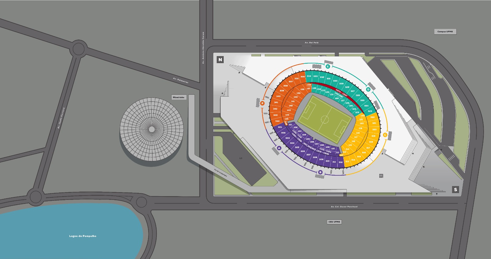 Setores: Amarelo Superior, Amarelo Inferior, Laranja Inferior, Azul Inferior e Roxo Inferior
