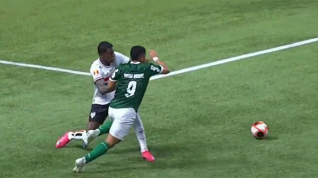 “Essa perna esquerda, ele coloca sim. Ele (Arboleda) faz o calço com a perna esquerda na perna esquerda do jogador adversário (Vitor Roque). Esse é o momento do calço. Perna esquerda com perna esquerda também. Esse é o contato. Então, o pênalti está confirmado”, disse Rodrigo Guarizo Ferreira do Amaral.