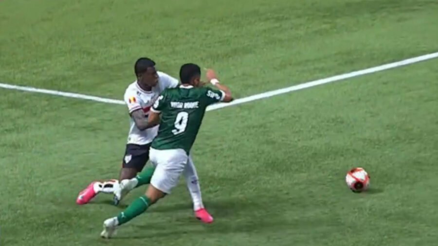 “Checa para mim. Ele (Arboleda) perde a bola. O jogador (Vitor Roque) dá um tapa para correr e ele põe a perna”, disse o árbitro Flávio Rodrigues de Souza.