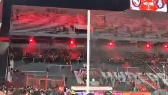 Vídeos que circulam nas redes sociais mostra o momento em que o torcedor se pendura na grade e, depois, cai. Um outro registro mostra um homem caído e depois se levantando no mesmo local onde ele foi registrado.