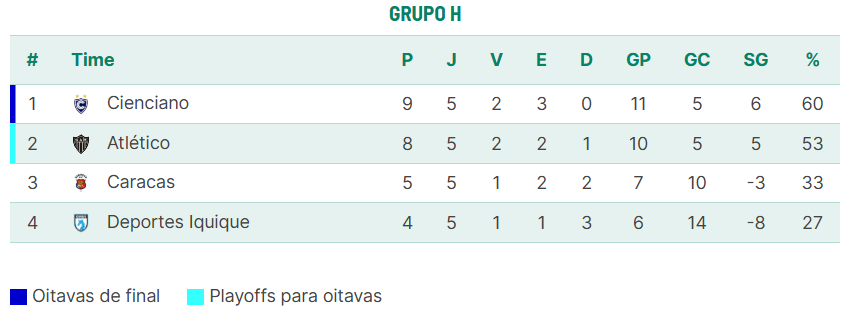 O Atlético é o vice-líder do Grupo H da Copa Sul-Americana, com oito pontos – em campanha que tem duas vitórias, dois empates e uma derrota. Quem ocupa a ponta da chave é justamente o Cienciano, que soma nove pontos.