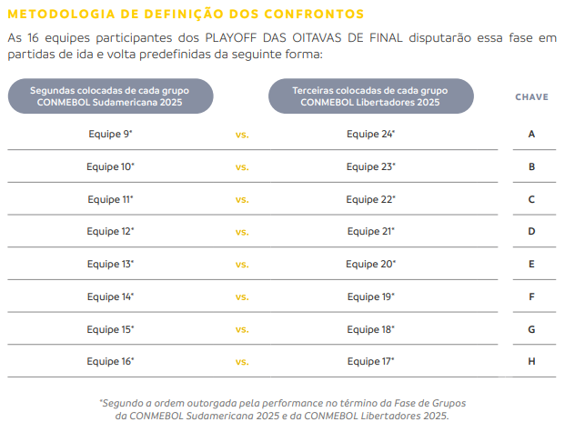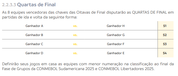 Ainda de acordo com o Manual de Clubes da Sul-Americana de 2025, os clubes com “menor numeração na classificação” geral decidirão as quartas de final como mandantes. É o caso do Atlético, que terá a oportunidade de definir a eliminatória contra o Bolívar na Arena MRV, em Belo Horizonte.