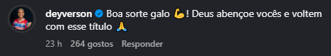 No Instagram, nessa quarta-feira (19/11), o Atlético compartilhou fotos de jogadores alvinegros enquanto embarcavam em ônibus antes de ida ao Aeroporto Internacional de Confins, na Região Metropolitana de Belo Horizonte. Nos comentários da publicação, Deyverson mostrou apoio. “Boa sorte, Galo! Deus abençoe vocês, e voltem com esse título”, disse.