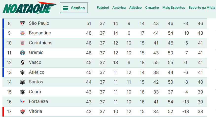 Em suma, o Atlético se preocupa em não encerrar a competição nacional na 15ª ou na 16ª posição para assegurar o direito de disputar o torneio continental outra vez em 2026. O caminho mais simples é por meio de uma vitória sobre o Vasco – que poderia levar o Galo até mesmo ao 10º lugar, com 48 pontos.