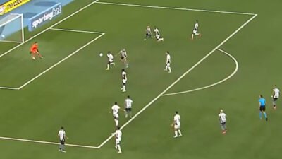 O curioso é que a bola começou em posse dos equatorianos. Contudo, o atacante Arthur Cabral recuperou a redonda e fez o passe na esquerda para Montoro, que foi parcialmente desarmado pelo zagueiro Richard Mina.
