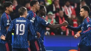 Há 13 jogos sem perder, o Arsenal ampliou a boa fase nesta terça-feira (4/11) ao vencer o Slavia Praga por 3 a 0, na Fortuna Arena, pela quarta rodada da Liga dos Campeões. Mikel Merino, autor de dois gols, foi o destaque do jogo. Saka também balançou as redes pelo time inglês.