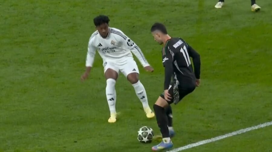 No segundo tempo, por volta dos 17 minutos, com o placar ainda em 0 a 0, Martinelli dominou a bola na linha lateral e, ao notar a aproximação de Endrick, tocou por debaixo das pernas do atacante merengue.