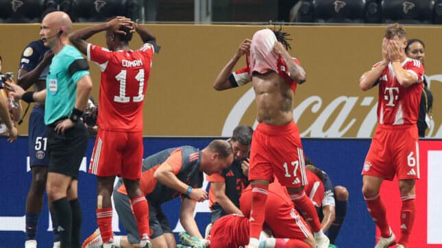 O Bayern perdeu para o atual campeão da Champions League, PSG, por 2 a 0, com gols de Doué e Dembélé. Com isso, foi eliminado do Mundial de Clubes nas quartas de final do torneio. A equipe francesa brigará por uma vaga na final com o Real Madrid, que eliminou o Borussia Dortmund por 3 a 2.