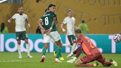 Por outro lado, o Palmeiras só foi “conhecer” a área adversária a partir do minuto 37 da etapa inicial. Nessa primeira chegada, Facundo Torres cruzou e encontrou Vitor Roque e Allan livres e impedidos na área. O último até tentou finalizar, mas errou o movimento, e a bola foi para a direção contrária. Quatro minutos depois, Vanderlan cabeceou para uma defesa tranquila de Sánchez.