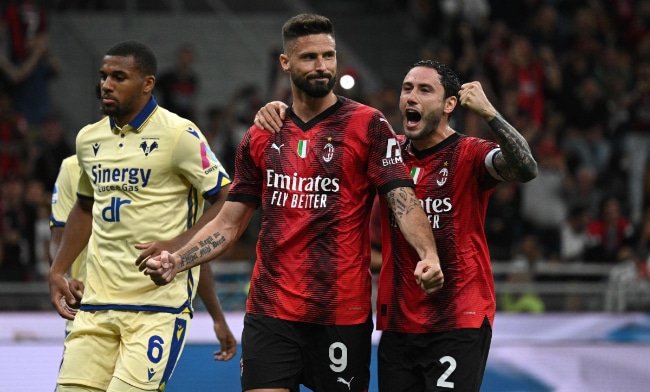 No primeiro tempo, o Milan se impôs desde os primeiros minutos e dominou a posse de bola, mas sem oferecer perigo ao gol do Verona. Nos acréscimos, o árbitro marcou pênalti para o Milan, após falta em Brahim Diaz. Giroud cobrou no ângulo direito do goleiro Montipo, para colocar os donos da casa na frente do placar aos 47 minutos.