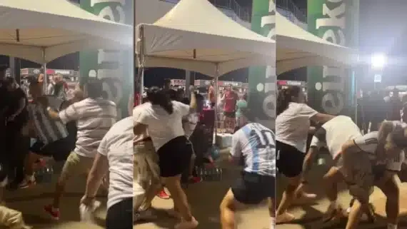 No vídeo, é possível ver um torcedor com camisa da Argentina acertando outro com blusa listrada. Um terceiro entra na briga, enquanto uma mulher tenta separar. As imagens viralizaram nas redes sociais,
