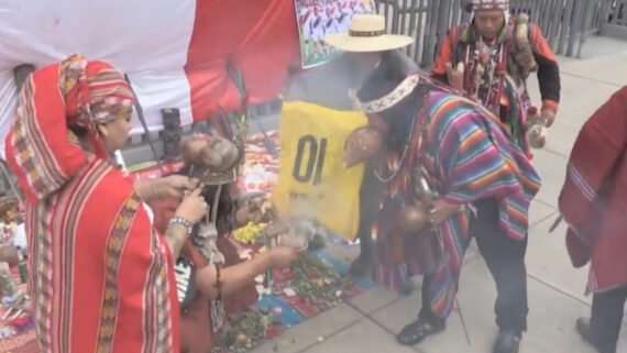 Vestindo tradicionais trajes coloridos de lã, os dez indígenas das montanhas, da selva e do litoral do Peru rezaram o ‘Tayta Inti’ (Pai Sol) e lançaram feitiços a favor da seleção do país.