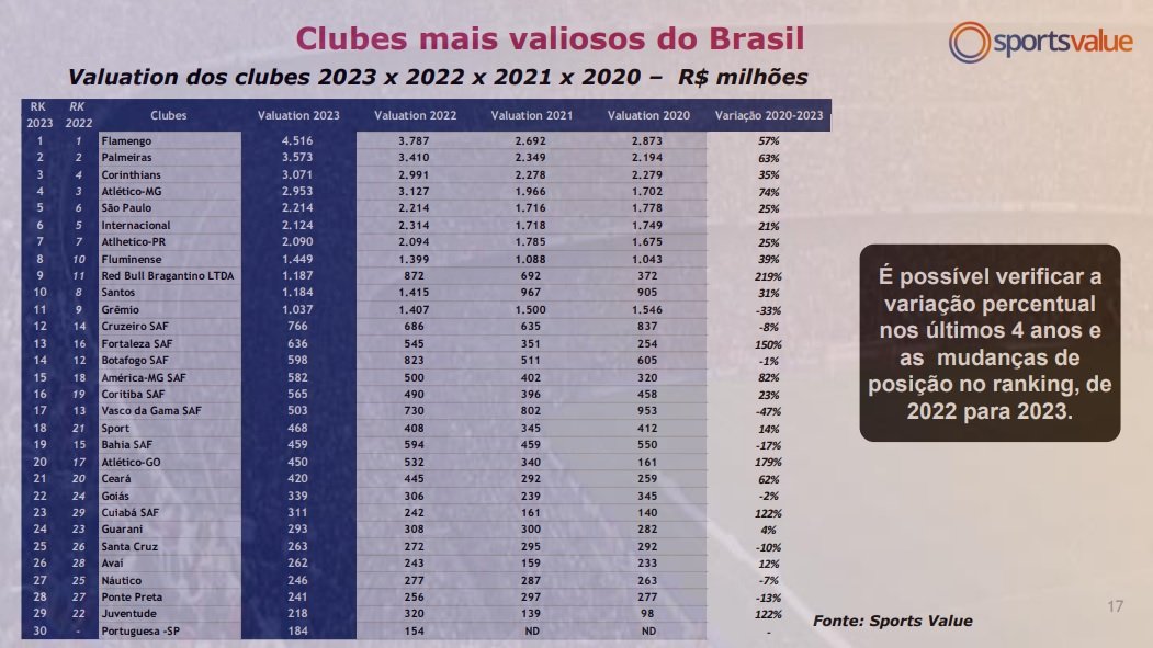 Os 10 clubes com maior valuation do futebol brasileiro em 2023:
