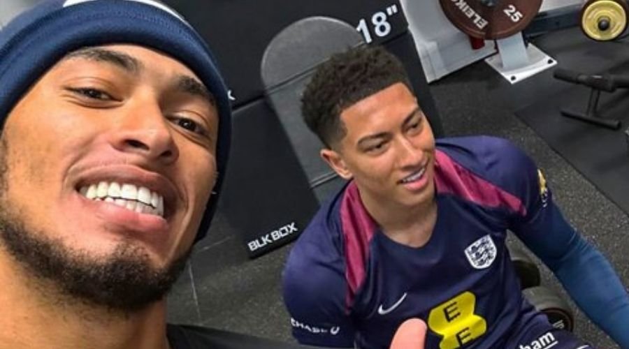 O meio-campista Jude Bellingham, do Real Madrid Madrid, compartilhou foto de treino ao lado do irmão mais novo Jobe Bellingham no centro de treinamentos da Inglaterra.