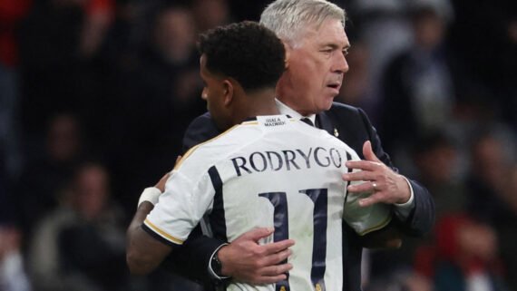 Carlo Ancelotti admite que o pupilo passa por fase de instabilidade: “Quando um jogador não está bem, não está bem emocionalmente. O Rodrygo quer mostrar qualidade e ajudar a equipe”.