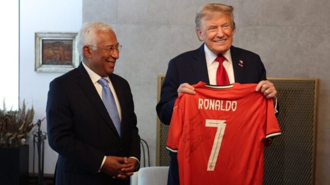 O líder norte-americano recebeu a camisa de CR7 das mãos de António Costa, presidente do Conselho Europeu, nessa segunda-feira (16/6), durante encontro do G7 – grupo de países com as sete economias mais avançadas do mundo: Alemanha, Canadá, Estados Unidos, França, Itália, Japão e Reino Unido. A reunião ocorreu em Calgary, no Canadá.