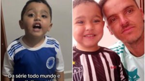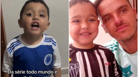 Mesmo com a influência dos dois, o menino de 3 anos parece já ter escolhido um lado. Em vídeo publicado neste sábado (23/8), ele canta o hino do Galo mesmo vestido com a camisa da Raposa.