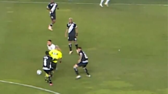 Jair se aproximou para ajudar o companheiro, mas Daronco estava na frente da jogada. O ex-Atlético, então, deu uma rasteira no árbitro, ainda longe do lance.