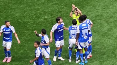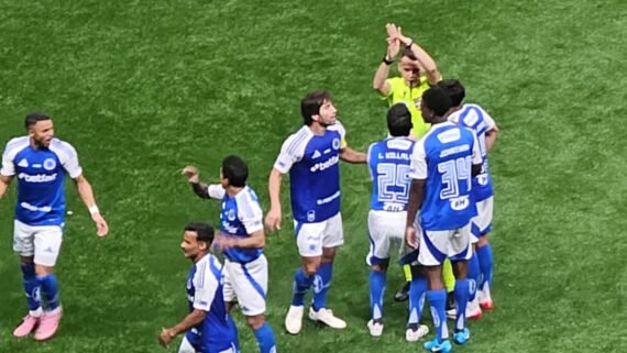 Irritados com a marcação errada da arbitragem, jogadores do Cruzeiro foram para cima de Zanovelli. Em meio às reclamações, o centroavante Kaio Jorge fez um gesto de “roubo”.