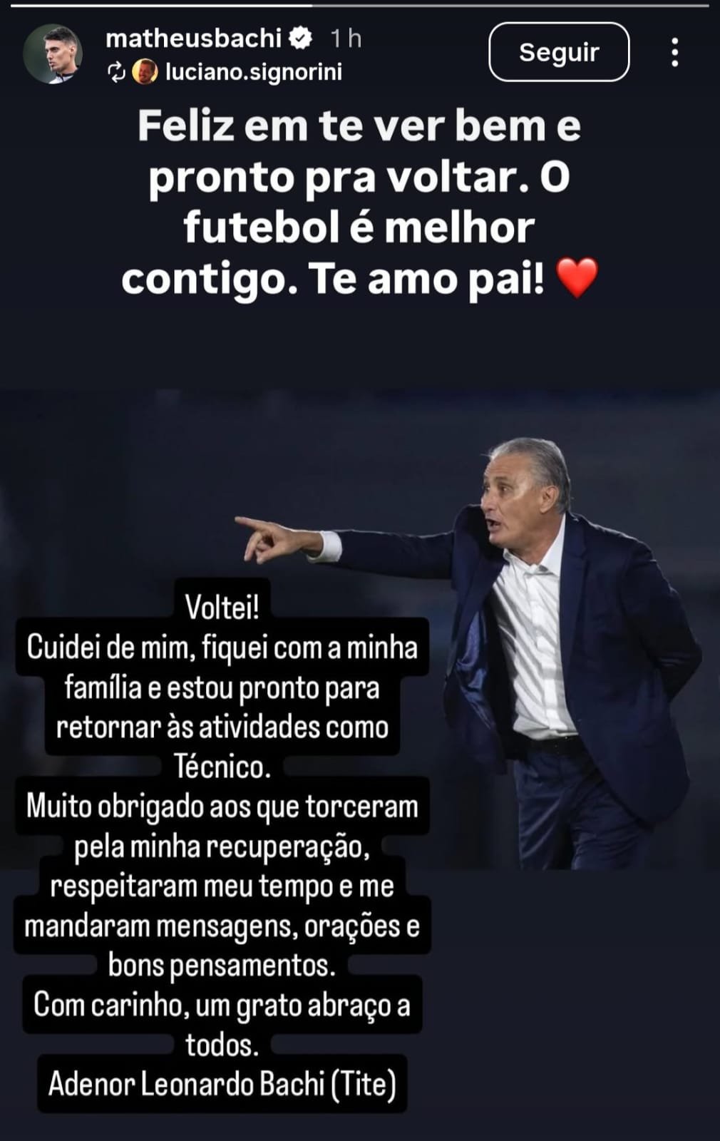 Matheus Bachi, filho de Tite e que também segue a carreira de treinador, repostou a publicação de Signorini e comentou: “Feliz em te ver bem e pronto para voltar. O futebol é melhor contigo. Te amo, pai”.